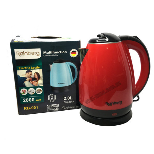 Электрочайник с мощностью 2000W от Rainberg RB-901 в пластиковом корпусе емкостью 2 литра. Нагревательный элемент чайника выполнен из нержавеющей стали и имеет закрытый тип, что позволит увеличить строк службы чайника и защитит элемент от накипи.